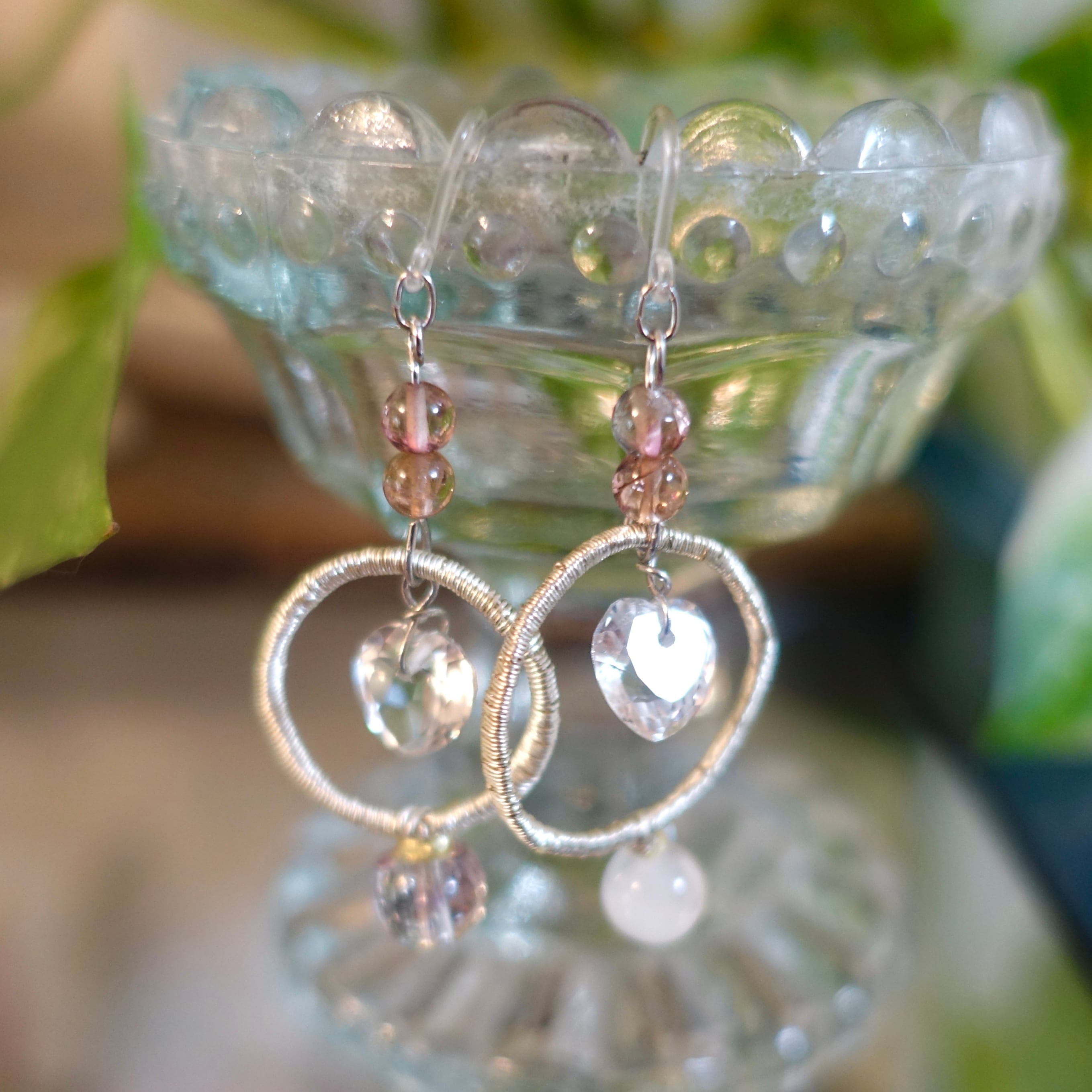 フープがワイヤー手作りのため少し形が歪ですが、ワイヤーとクリアクォーツのカットが雪の結晶のようにキラキラと輝きます。