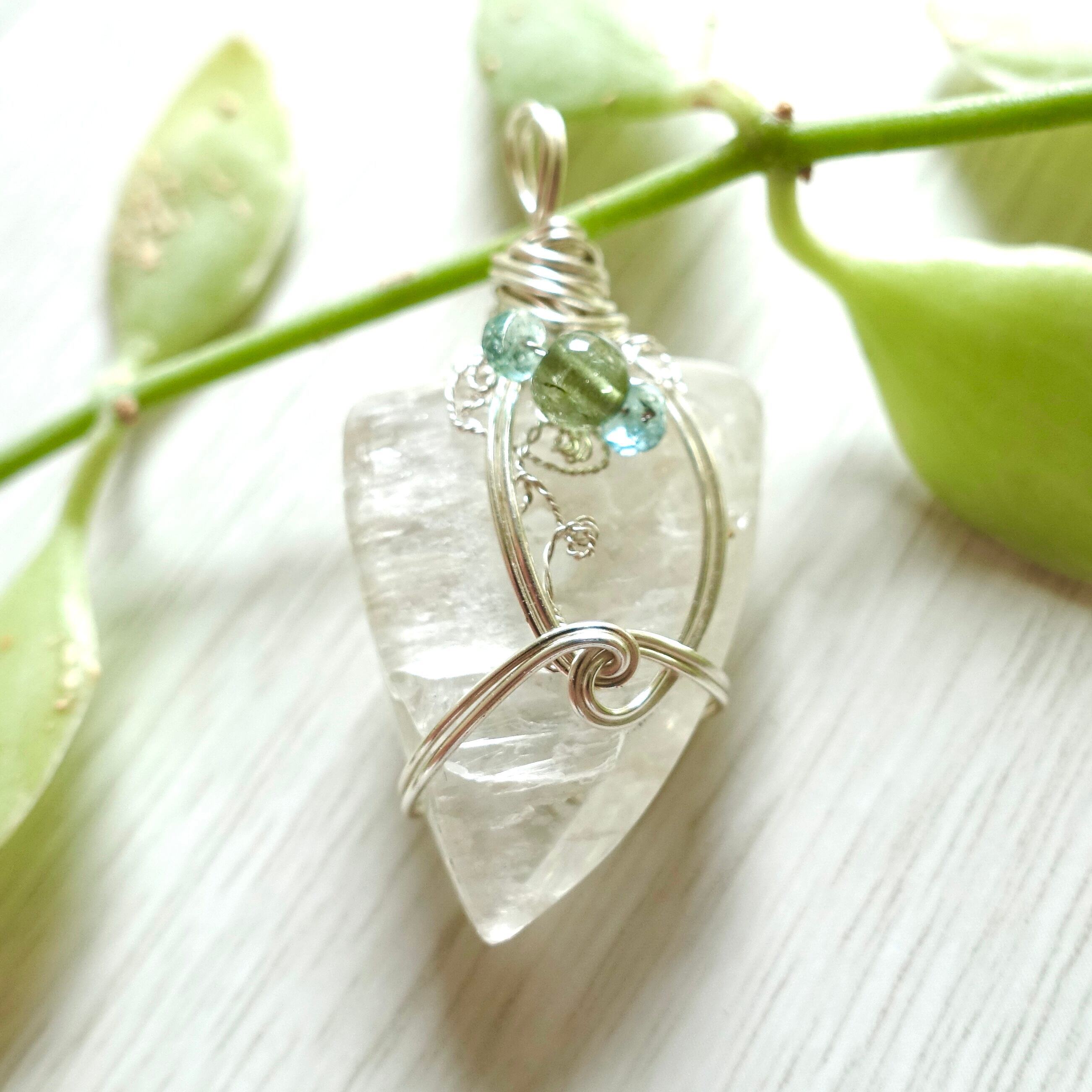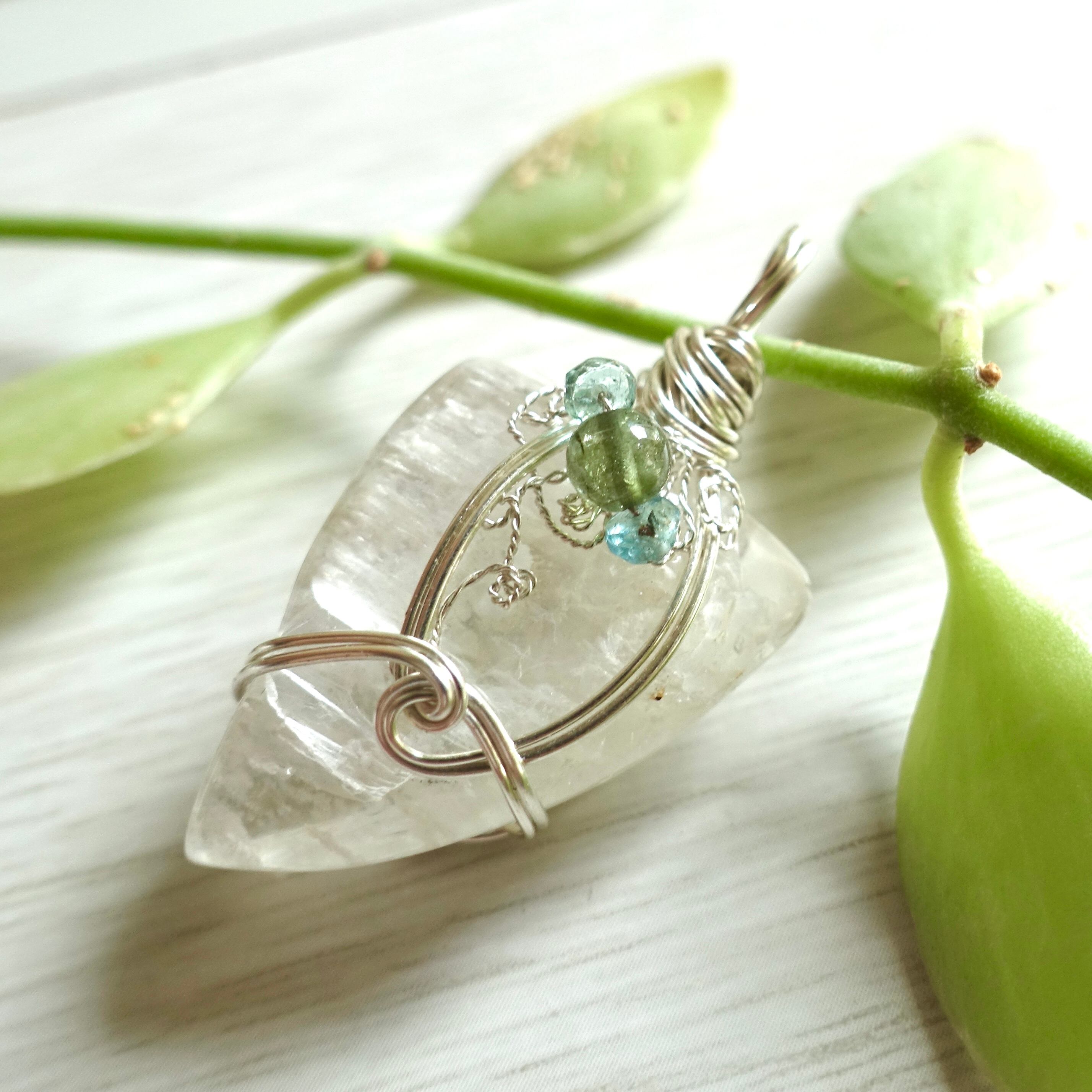 グリーンのトルマリンとエメラルドと、繊細なシルバーのワイヤーで、月の雫やレムリア、女神のような雰囲気が強くなってます。