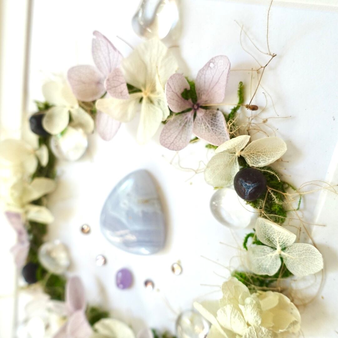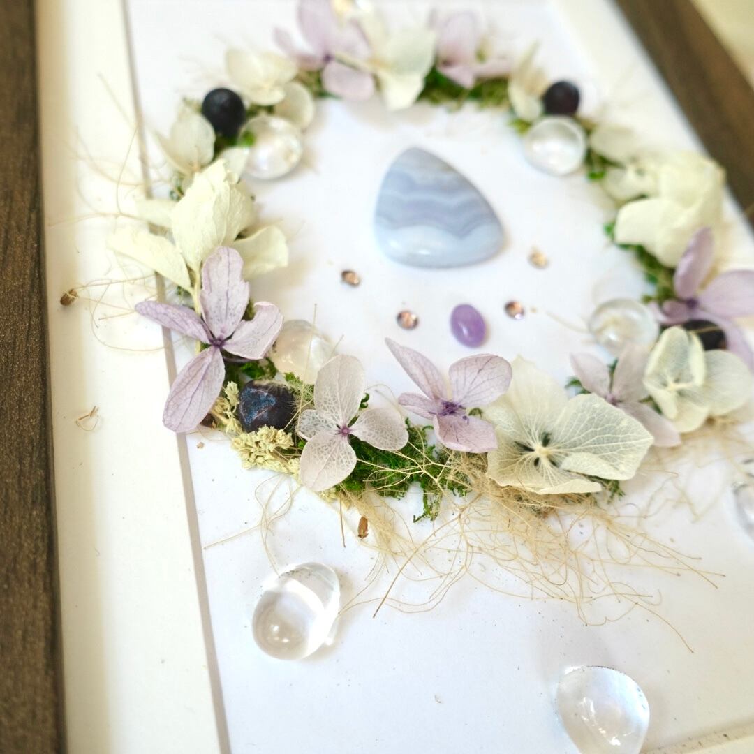 スモークツリーやジュニパーベリー、紫陽花たちの輪の中に、美しいハートのコミュニケーションをサポートするブルーレースアゲートと、穏やかに心地よい癒しを届けるライラックアメジストとスワロフスキー、水晶チップで制作しました。