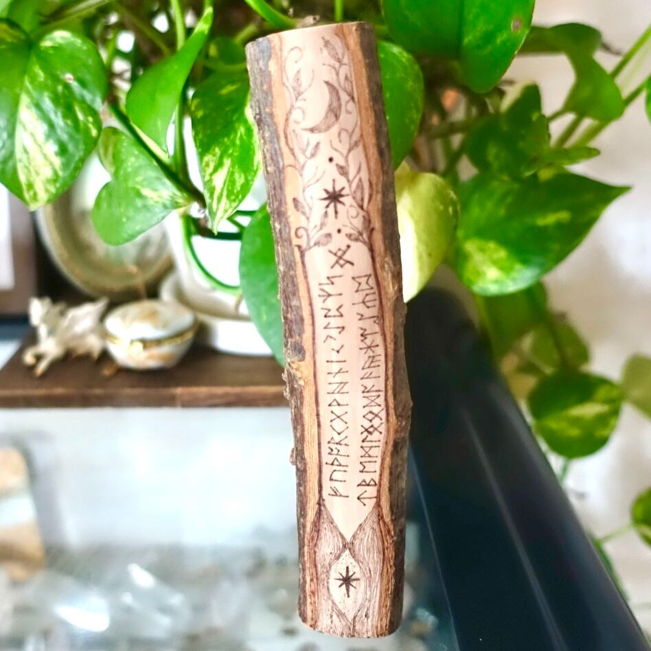 こちらのスティックはルーン文字面に月と星を描き、月のエネルギーを受け取ることと、頭上と足元のあなたの星(ソウルスターとアーススター・地球での使命や目的、ブループリントなどと関わりある星)が輝くのを意図してみました。